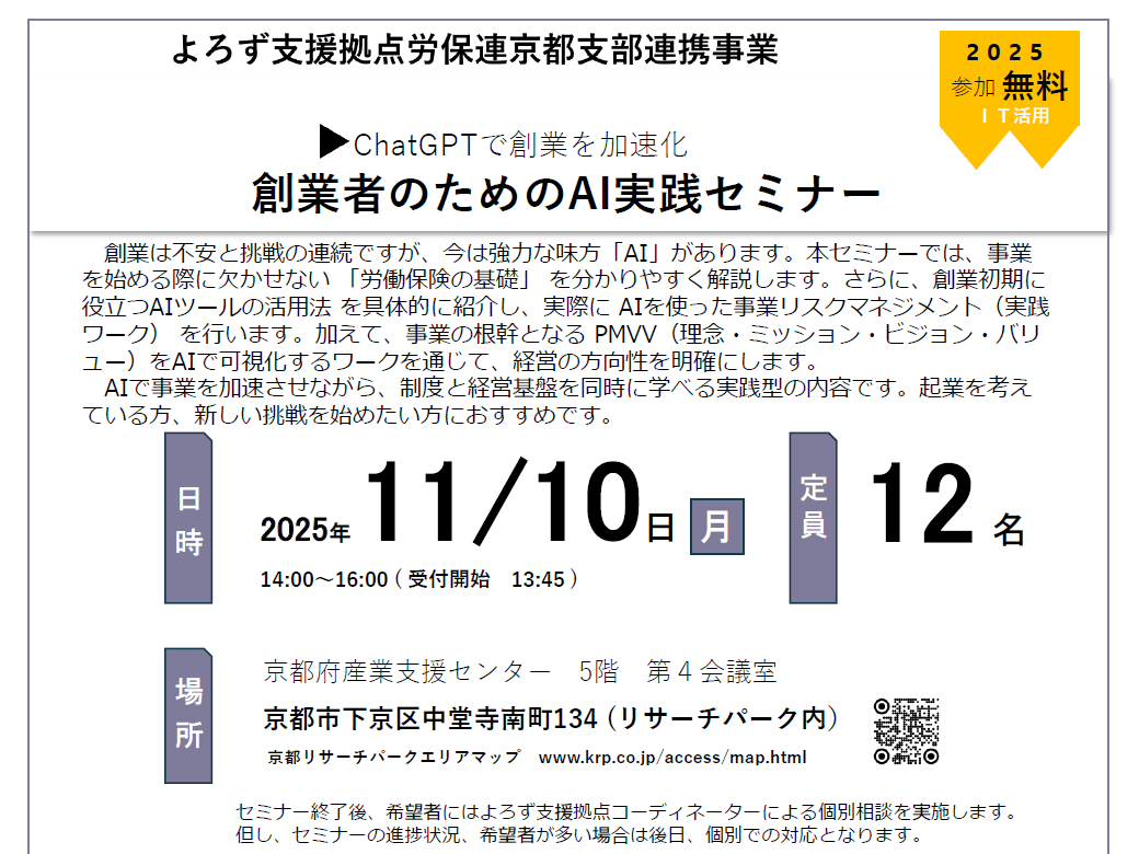 創業は不安と挑戦の連続ですが、今は強力な味方「AI」があります。本セミナーでは、事業を始める際に欠かせない 「労働保険の基礎」 を分かりやすく解説します。さらに、創業初期に役立つAIツールの活用法 を具体的に紹介し、実際に AIを使った事業リスクマネジメント(実践ワーク) を行います。加えて、事業の根幹となる PMVV(理念・ミッション・ビジョン・バリュー)をAIで可視化するワークを通じて、経営の方向性を明確にします。