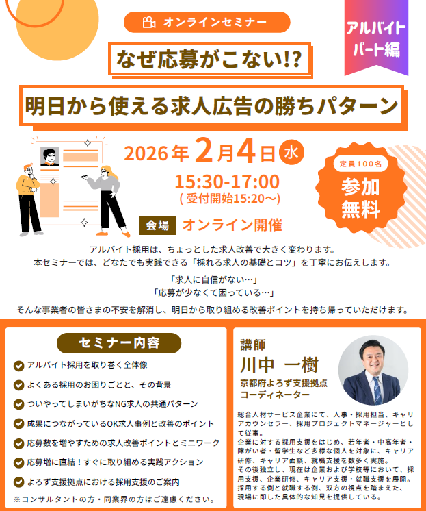 本セミナーでは、どなたでも実践できる「採れる求人の基礎とコツ」を丁寧にお伝えします。