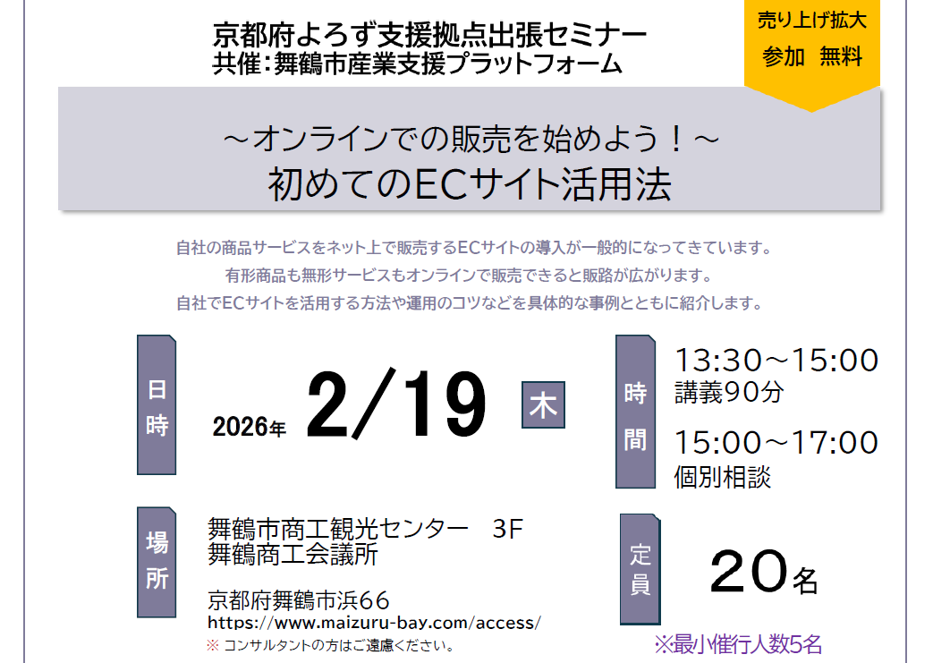 | 主催 | 京都府よろず支援拠点(公益財団法人京都産業21) |